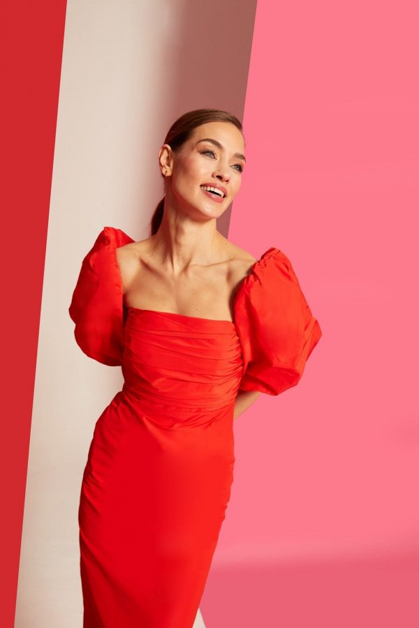 Vestido midi con mangas abullonadas rojo de la marca española Bimani. Perfecto para tu evento de día primavera-verano.